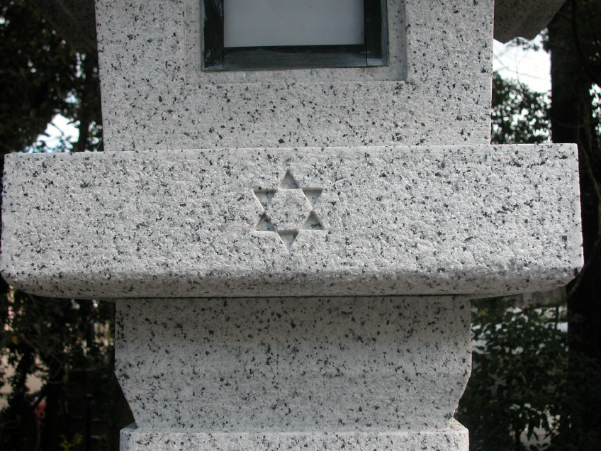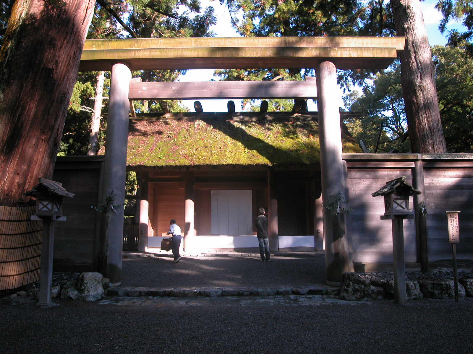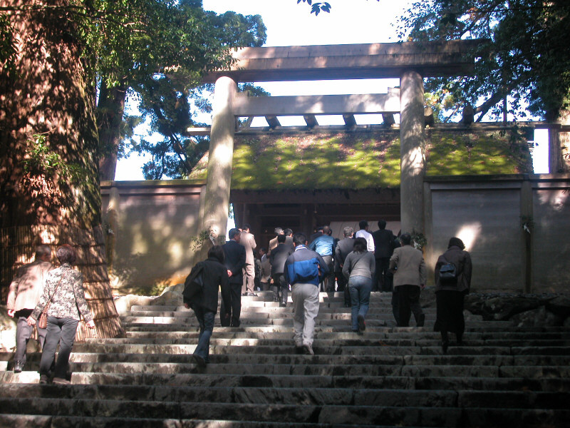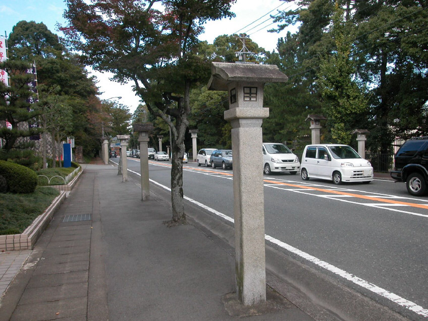 <伊勢神宮 外宮 豊受大神宮> <伊勢神宮 内宮 皇大神宮> <内宮周辺の道路に立てられている石灯篭> <石灯篭に刻まれている紋章>